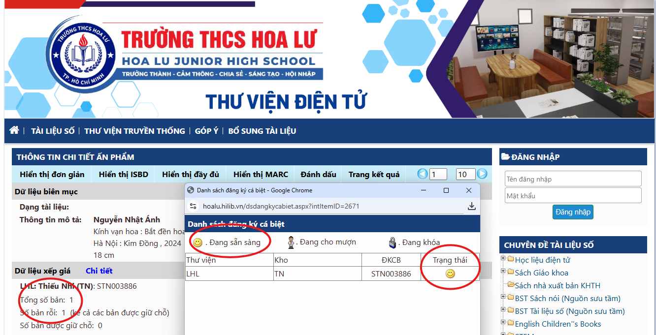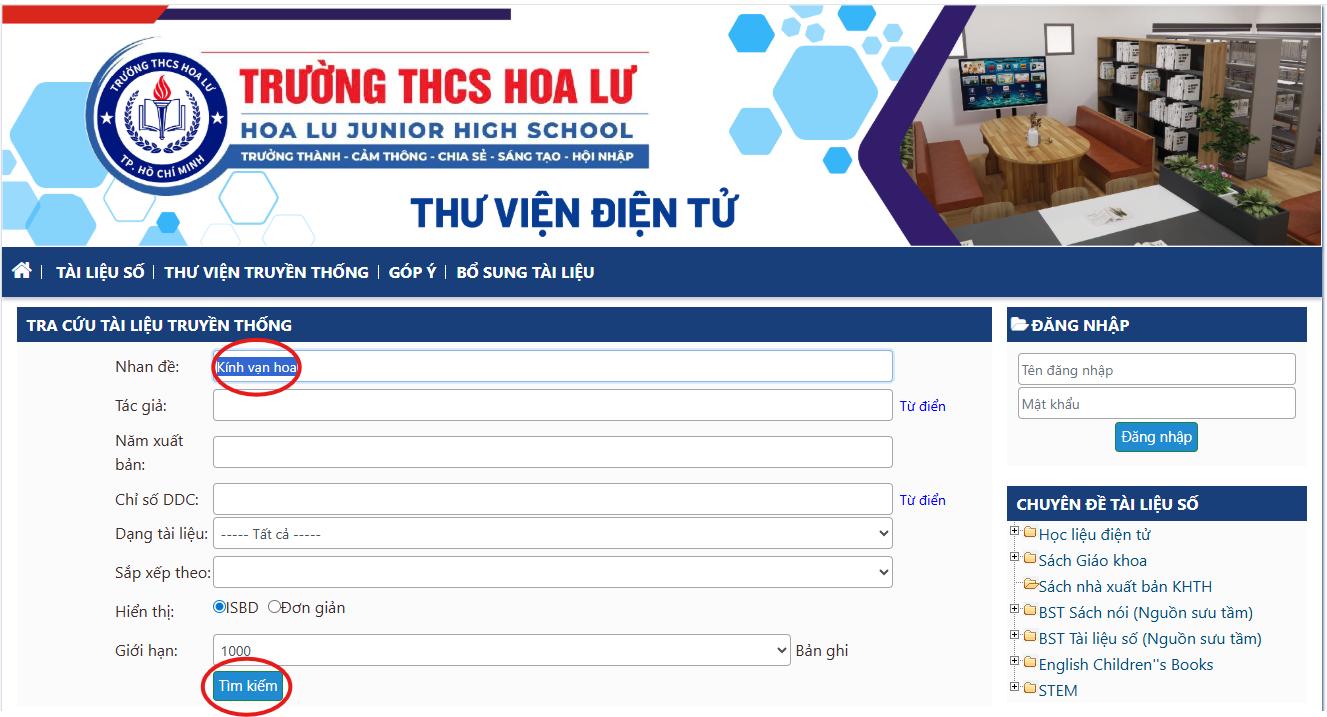 Bước 1: Đăng nhập vào Website của Thư viện tại: hoalu.hilib.vn