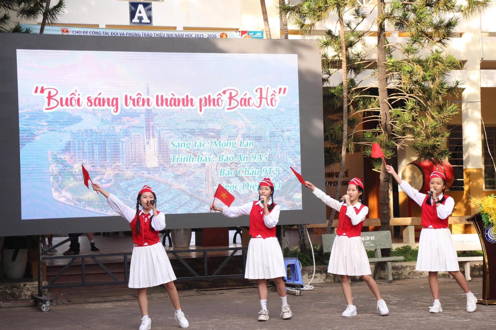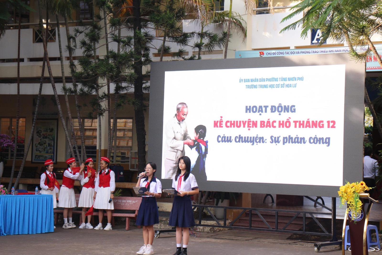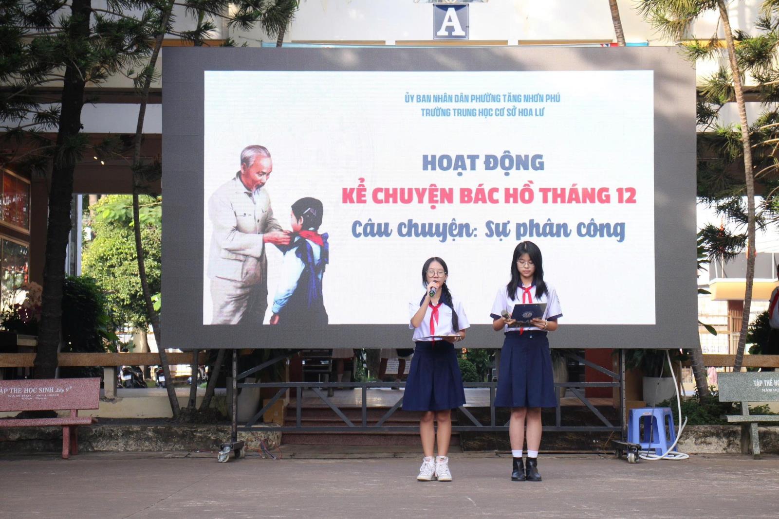 Sáng ngày 8/12/2025, tại sân cờ Trường THCS Hoa Lư đã thực hiện Hoạt động Kể chuyện Bác Hồ với câu chuyện “ Sự phân công” do hai bạn Phúc An lớp 9T1 và Khánh Băng lớp 9T3 thực hiện (Kể chuyện bằng song ngữ Anh – Việt).