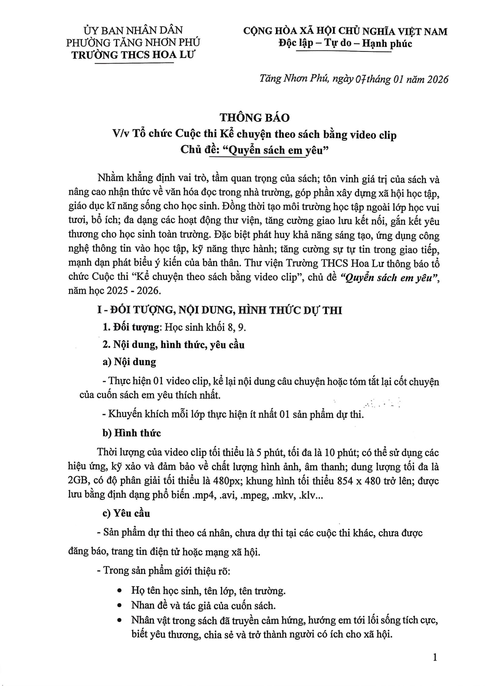 Thông báo V/v Tổ chức Cuộc thi Kể chuyện theo sách bằng video clip, Chủ đề: “Quyển sách em yêu”