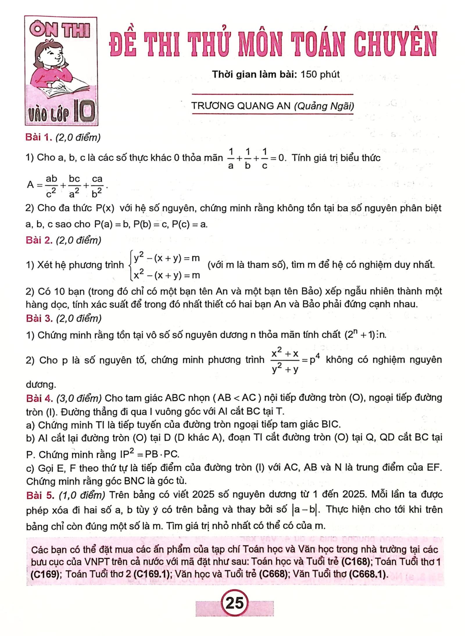 Bài trích tạp chí "Đề thi thử môn Toán chuyên, năm học 2025 - 2026", Số tháng 9 - 2025